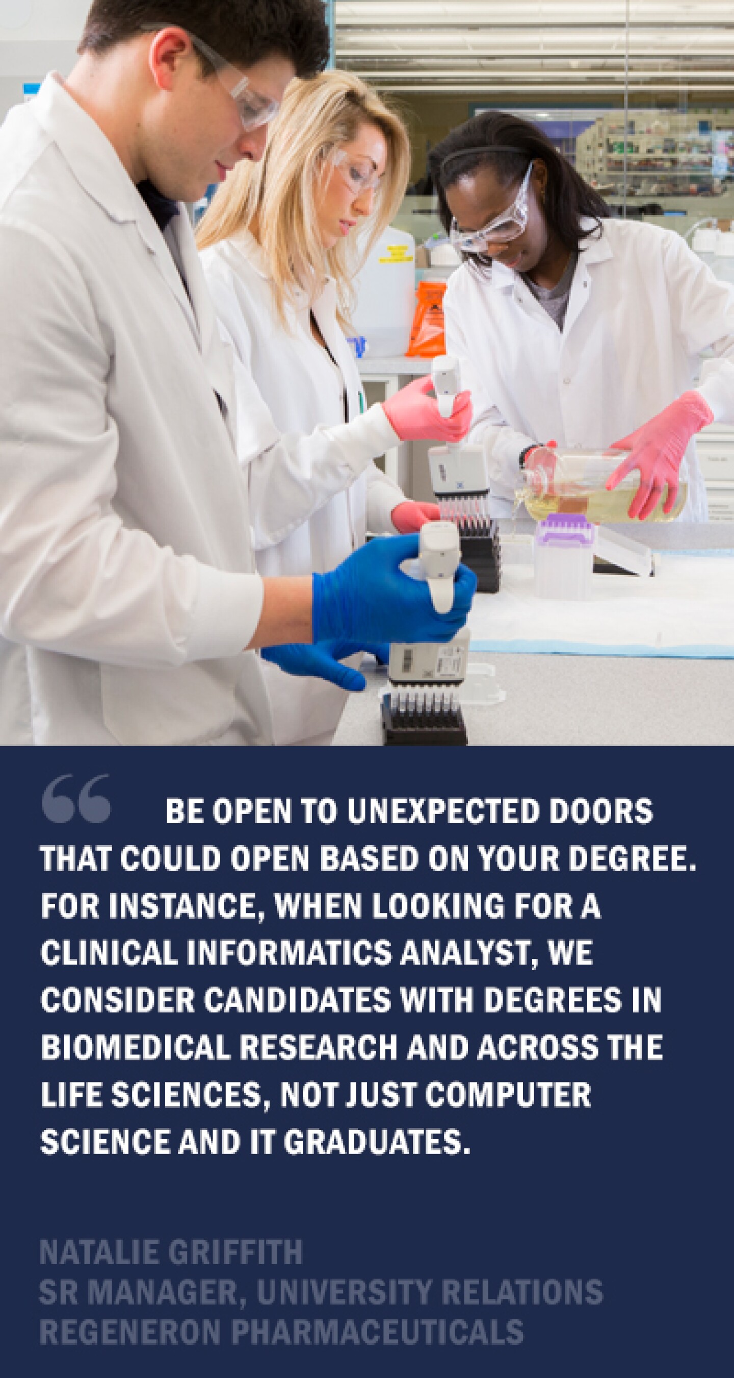 Griffith encourages life science graduates to practice interviewing, and to “interview” Regeneron to make sure the company is a good fit for you. Internships, as in most fields, are strongly encouraged. She also points out, “Be open to unexpected doors that could open based on your degree. For instance, when looking for a clinical informatics analyst, we consider candidates with degrees in biomedical research and across the life sciences, not just computer science and IT graduates.”