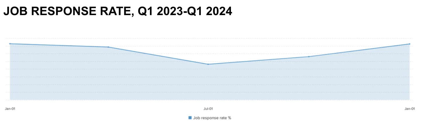The job response rate—the percentage of people applying to job postings after viewing them—has risen year over year, according to BioSpace data, indicating competition for roles posted on our website has increased. The rate was 18.3% for the first quarter of 2024, up from 15.8% for the first quarter of 2023. It peaked at 20.1% in January.