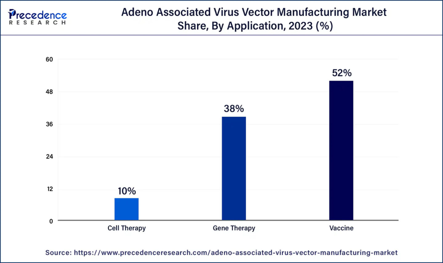 The vaccines segment holds the largest share in the Adeno-associated virus (AAV) vector manufacturing market. Propagation of AAV in tissue culture necessitates the assistance of helper viruses, traditionally adenovirus (AdV) and herpes virus (HSV). The AAV vector, a recombinant variant of the wild-type AAV virus, replaces its native coding and non-coding regions with the gene of interest while retaining the lateral ITR, the only cis-acting element required for AAV DNA replication and encapsidation. These modifications render recombinant adeno-associated viruses (rAAV) replication-defective, enabling them to infect cells and deliver DNA to the nucleus efficiently. This application in vaccine development underscores the pivotal role of AAV vectors in advancing innovative and effective vaccine solutions.