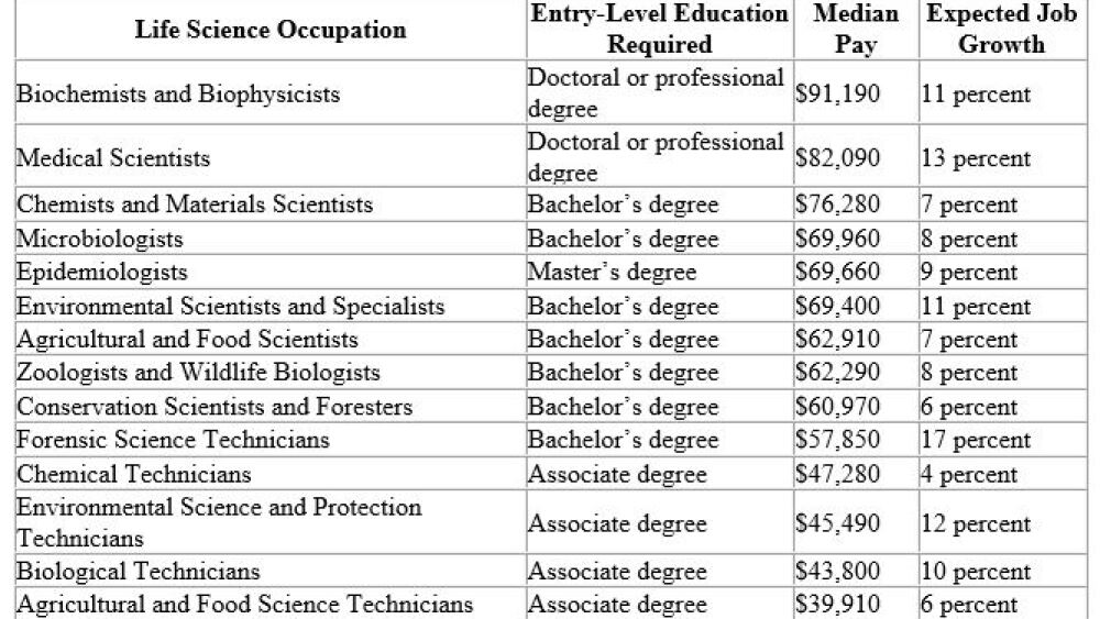 According to data from the Bureau of Labor Statistics (BLS) Occupational Outlook Handbook, employment in the life sciences is expected to increase 10 percent between 2016 and 2026, faster than the average for all U.S. occupations. While the median annual wage across life science occupations was $64,510 in May 2017, some positions – particularly those requiring post-graduate education – have the potential to earn more.