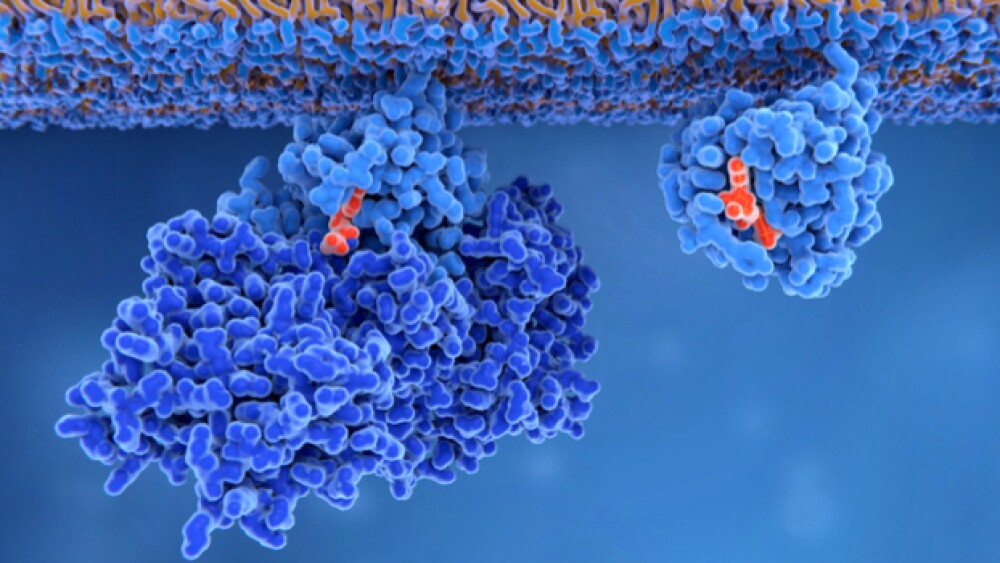 Membrane-bound Ras protein in its inactive form (left) and activated form (right). Mutations in this protein can lead to solid tumors.