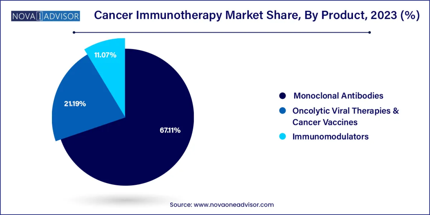 The lungs cancer segment dominated the global cancer immunotherapy market in 2023. The growth of this segment can be attributed to factors such as growing trend of smoking cigarettes and exposure to asbestos in construction activities. Also, rise in the number of cases of non-small cell lung cancer, small cell lung cancer and mesothelioma had increased the demand for immunotherapies, thereby driving the market growth. According to a study by Cancer.net, around 14% lungs cancer patients suffered from Small Cell Lung Cancer (SCLC). It also estimated that approximately 238,440 adults (117,550 men and 120,790 women) in the US is expected to be suffering from lungs cancer in 2023. Moreover, cancer therapy companies are launching several immune therapies for treatment of cancer that drives the growth of the cancer immunotherapy market. For instance, in February 2024, Bristol Myers Squibb announced that The U.S. Food and Drug Administration (FDA) and the European Union (EU) have approved their immunotherapy for the treating patients suffering from non-metastatic non-small cell lung cancer.