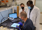 BioConsortia's team studies the positive impact of their new nematicide on protecting tomato roots from nematode damage. Fidele Akum PhD (right) and Dan Touchard BA (left), with Debbie Wilk PhD - Director of Plant Pathology and leader of the Namaticide project. (Photo: Business Wire)