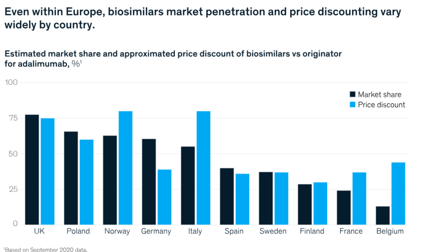 In maturing European markets, biosimilars adoption exceeds 46 percent by volume across all molecules. However, this aggregate number masks wide variations in uptake between individual markets and molecules resulting from differences in policy, utilization of tenders, pricing and reimbursement, prescriber education.
