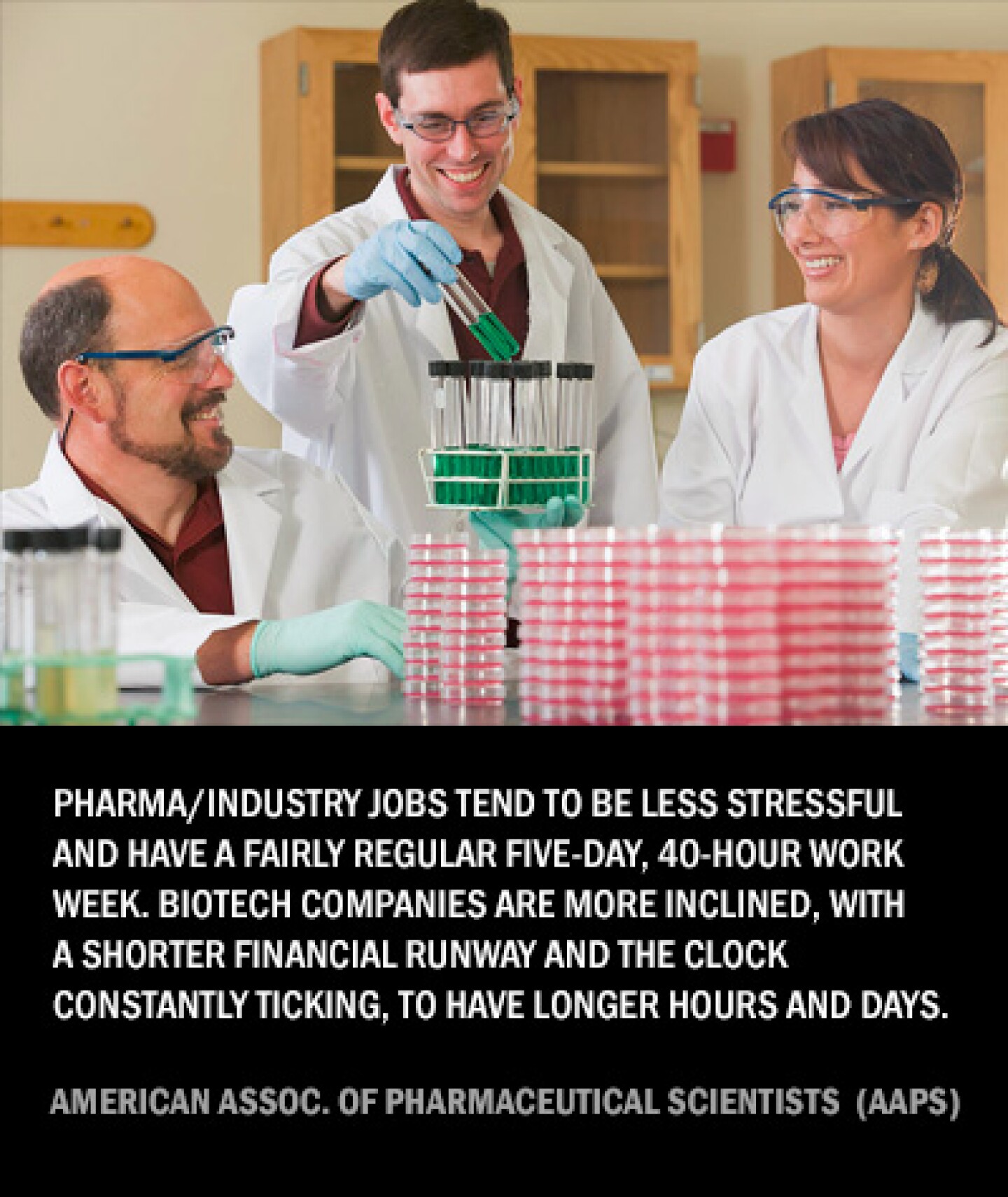 In addition, Clifford Mintz, writing for the American Association of Pharmaceutical Scientists (AAPS), notes that pharma/industry jobs tend to be less stressful and have a fairly regular five-day, 40-hour work week. Biotech companies are more inclined, with a shorter financial runway and the clock constantly ticking, to have longer hours and days.