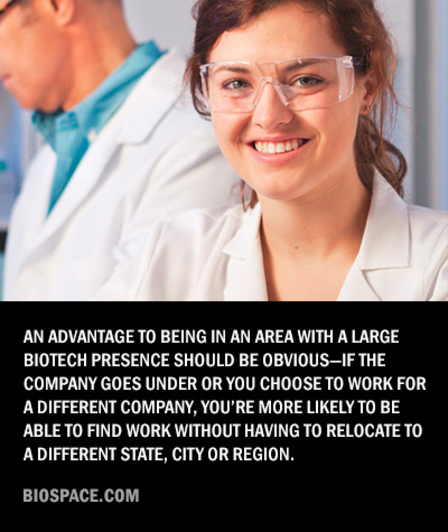 An advantage to being in an area with a large biotech presence should be obvious—if the company goes under or you choose to work for a different company, you’re more likely to be able to find work without having to relocate to a different state, city or region.