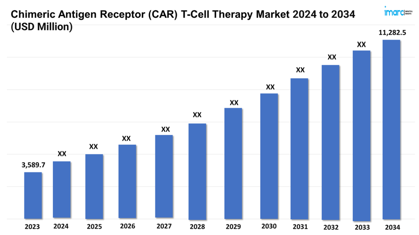 The CAR T-Cell Therapy Market Size reached a value of USD 3,589.7 Million in 2023. Looking forward, IMARC Group expects the 7MM to reach USD 11,282.5 Million by 2034, exhibiting a growth rate (CAGR) of 10.85% during 2024-2034.