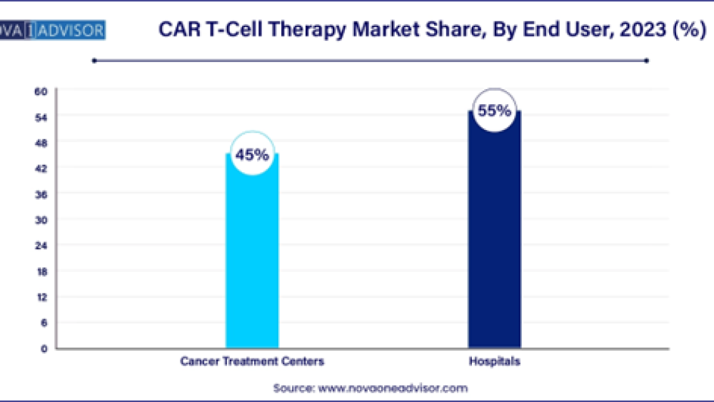 The hospital segment holds the largest market share in the global CAR T-cell therapy market, driven by its role in managing patients undergoing this advanced cancer treatment. CAR T-cell therapy recipients typically undergo a risk and recovery period lasting approximately 2 to 3 months post-treatment, during which they are closely monitored for treatment response and potential side effects. Hospital admissions are common during this period to manage and mitigate complications that may arise from the therapy. This underscores hospitals' pivotal role as primary care providers and treatment centers for CAR T-cell therapy patients, supporting their comprehensive medical needs from initial treatment through recovery phases.