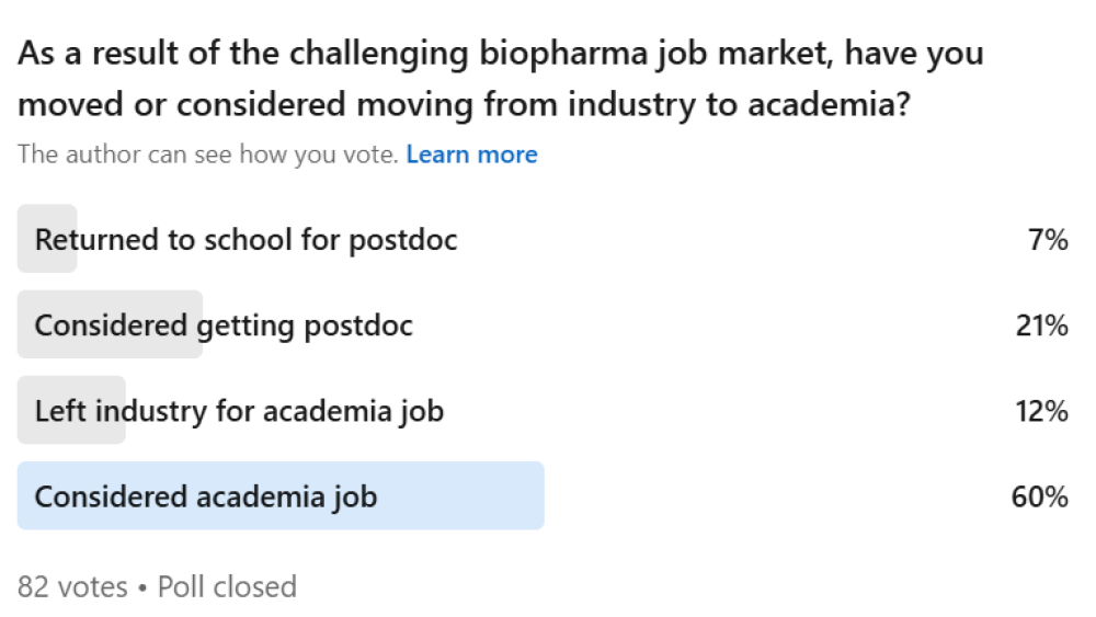 In a BioSpace LinkedIn poll this month, 60% of respondents said they’d considered leaving industry for a job in academia, and 12% had made that move, many of them for a postdoc.