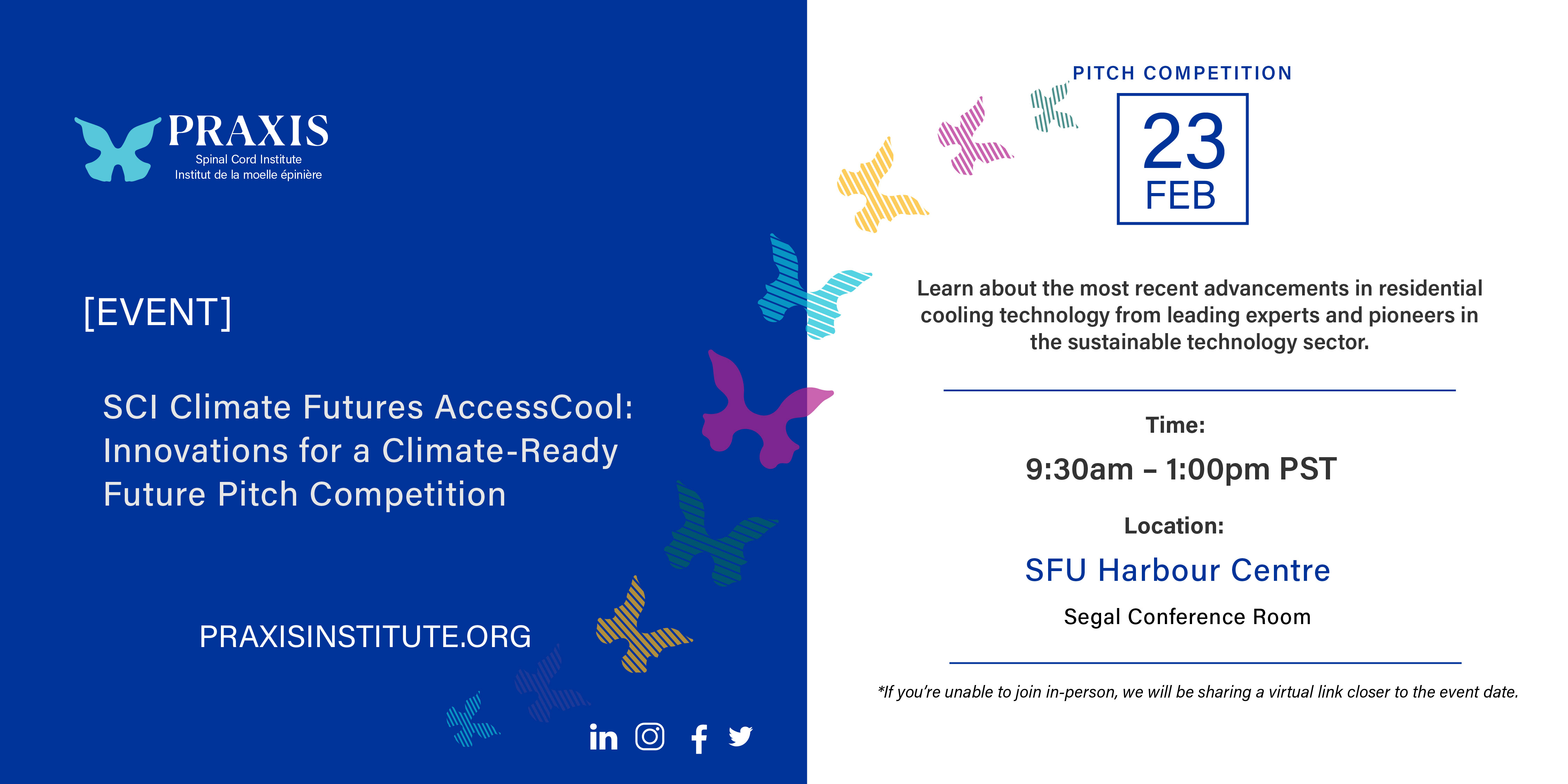 VANCOUVER, BC – February 20, 2024 – Praxis Spinal Cord Institute is launching “AccessCool: Innovations for a Climate-Ready Future”, a pitch competition for innovative cooling technologies and their potential to develop sustainable strategies, addressing the detrimental health effects of heatwaves on individuals with spinal cord injury (SCI) and other disabilities. This pitch competition is framed in the context of the 2021 heatwaves and the urgency to address resiliency for our most vulnerable. SCI Climate Futures aims to contribute to preparing B.C. to cope with and protect its citizens from heat dome events.