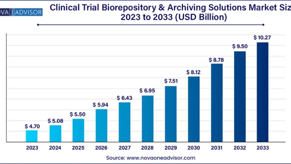 According to Nova one advisor, The global clinical trial biorepository & archiving solutions market size was estimated at USD 4.70 billion in 2023 and is projected to reach USD 10.27 billion by 2033, registering at a CAGR of 8.13% from 2024 to 2033.