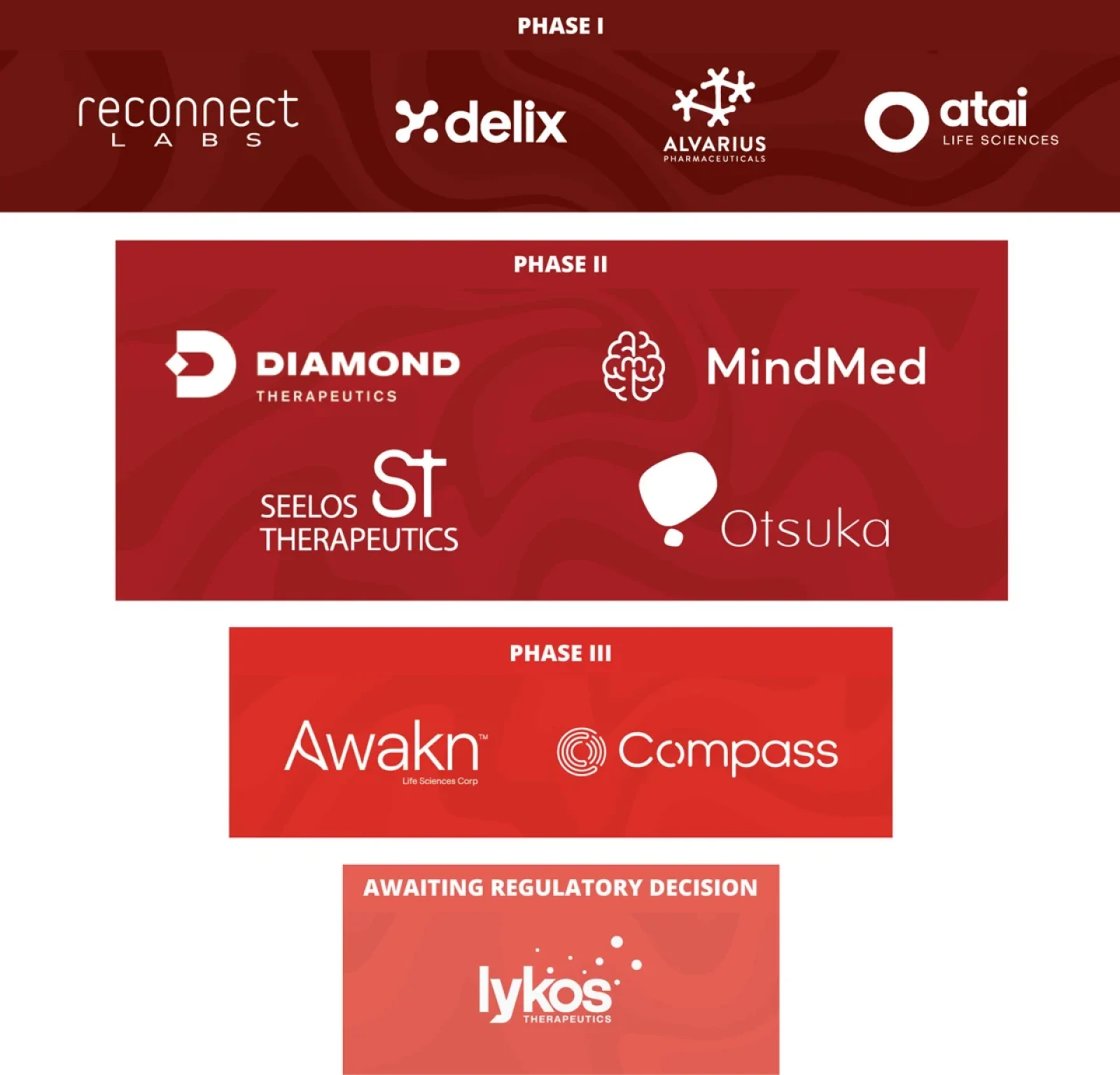 Note: This graphic was drawn from data collated by Psychedelic Alpha, is up to date as of December 2023, and does not represent all companies in Phase I and II.