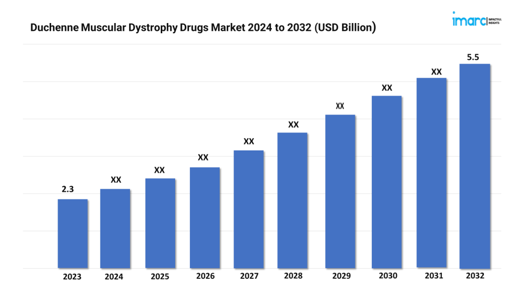 The duchenne muscular dystrophy drugs market size reached a value of USD 2.3 Billion in 2023. Looking forward, the market is expected to reach USD 5.5 Billion by 2032, exhibiting a growth rate (CAGR) of 9.96% during 2024-2032.