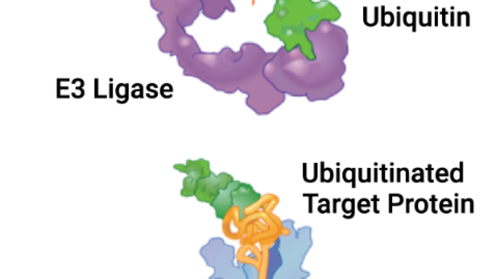 E3 ligases (shown in purple) are the key pathway components because they directly attach ubiquitin to the target protein (shown in gold) in the final step of the UPS; they are the gatekeeper between a protein being destroyed or not. Therefore, controlling the E3 ligase for a certain protein allows researchers to directly control the fate of the protein, either forcing it to be degraded or preventing its degradation.