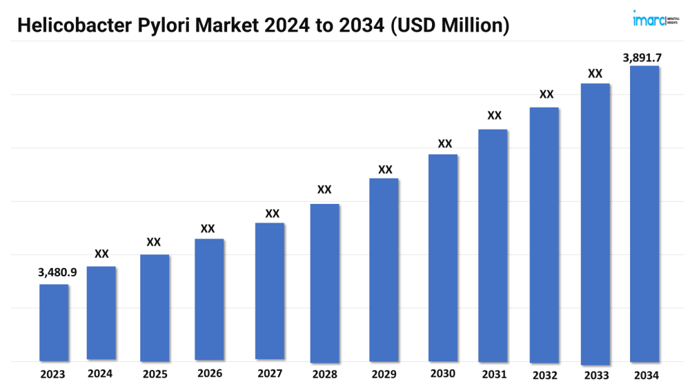 The helicobacter pylori market size reached a value of USD 3,480.9 Million in 2023. Looking forward, the market is expected to reach USD 3,891.7 Million by 2034, exhibiting a growth rate (CAGR) of 1.02% during 2024-2034.