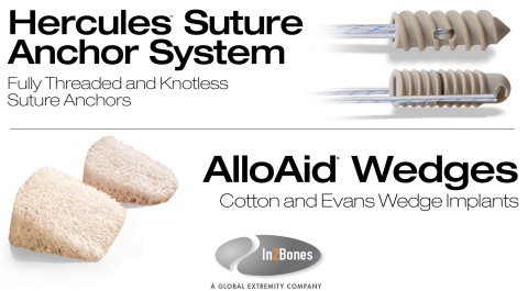 MEMPHIS, Tenn.--(BUSINESS WIRE)-- In2Bones Global, Inc. today announces the U.S. launch of its Hercules™ Suture Anchor System and AlloAid® Wedges for lower extremity surgeries. These advanced-design implant systems expand the company’s already robust portfolio of pre-sterilized and OR-ready extremity products.