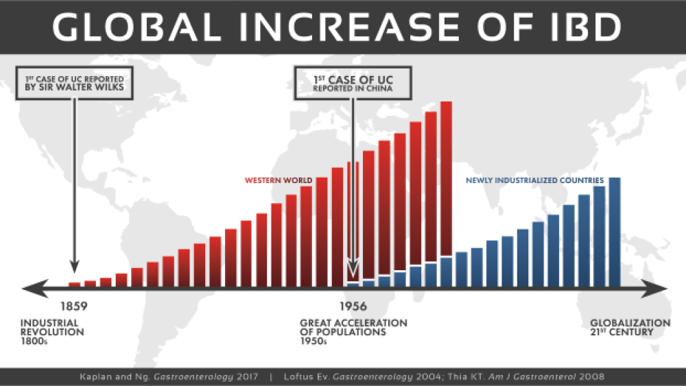 Historically IBD has been predominantly seen in industrialized countries, with the highest reported prevalence values in Europe and North America. In the United States alone, approximately 1.6 million people currently have Crohn’s disease or ulcerative colitis, and as many as 70,000 new cases of IBD are diagnosed each year. Although the incidence of IBD in North America and Europe is currently reported to be stabilizing or decreasing, the burden remains high as prevalence exceeds 0·3%. Over the last 30 years, the predominance of IBD has accelerated in newly industrialized countries including Africa, Asia and South America. Reports of IBD appear to be higher in urban areas than in rural areas, as well as in higher socio-economic classes. Individuals who immigrate to industrial urbanized developed nations before adolescence and those immigrants who initially belonged to a low-incidence population show a significantly higher incidence of IBD. This rise has been attributed to the rapid modernization and westernization of the population.