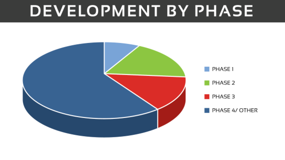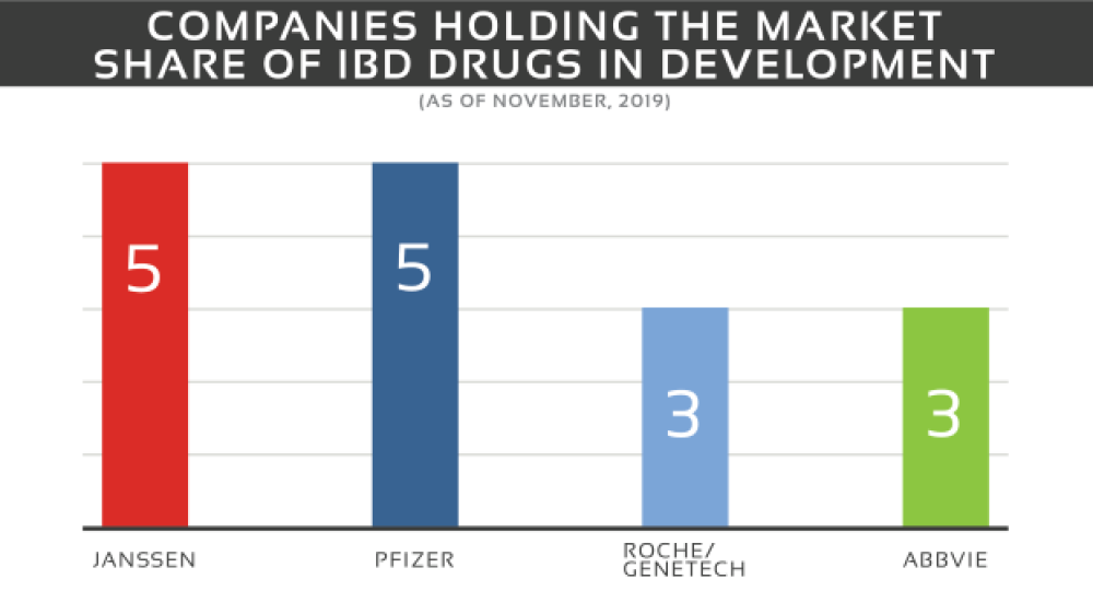 The IBD market contains a mixture of big and smaller sized pharma and biotech companies. The market share is dominated by Janssen with 5 drugs in all phases (I-III) and Pfizer with 5 drugs in phase I and II. The remaining companies include Roche in collaboration with Genentech with three drugs in phases I-III and AbbVie with three drugs in phase II, II/III and III.