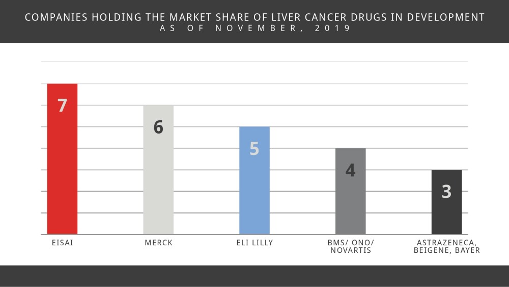 The liver cancer market contains a mixture of big and smaller sized pharma and biotech companies. The market share is dominated by Eisai, with 7 studies underway, followed by Merck (6 studies), Eli Lilly (5 studies), Bristol-Myers Squibb/Ono Pharmaceuticals and Novartis (4 studies each). AstraZeneca, BeiGene and Bayer bring up the rear, with 3 studies each. Note: These are industry-led and funded studies.