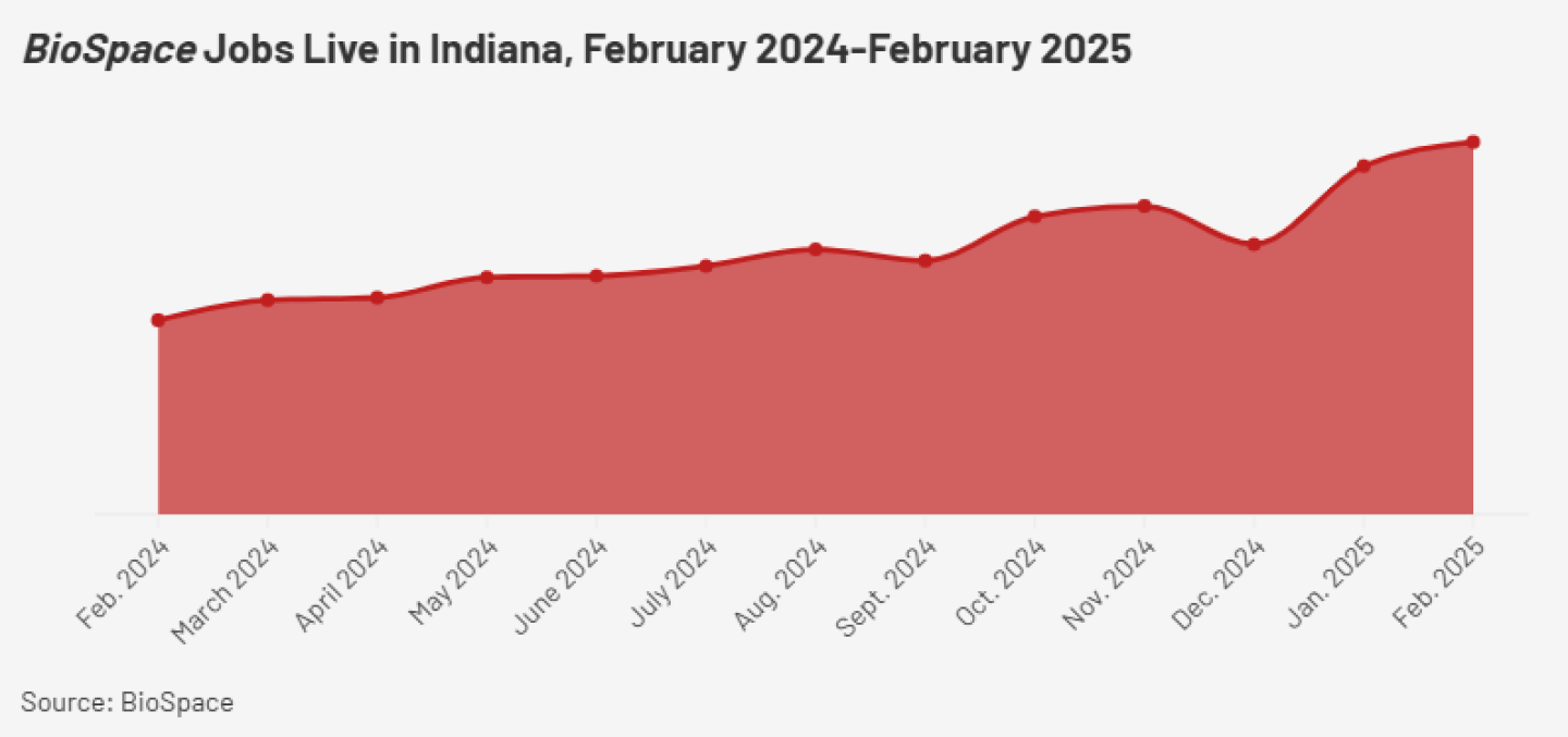 As part of the BioMidwest Hotbed, Indiana is home to more than 2,700 life sciences companies that employ over 65,000 people, according to the Indiana Life Sciences Association. Employment opportunities appear to be increasing in the state, based on BioSpace data. Job postings live on the website showed strong year-over-year growth, nearly doubling from February 2024 to February 2025.