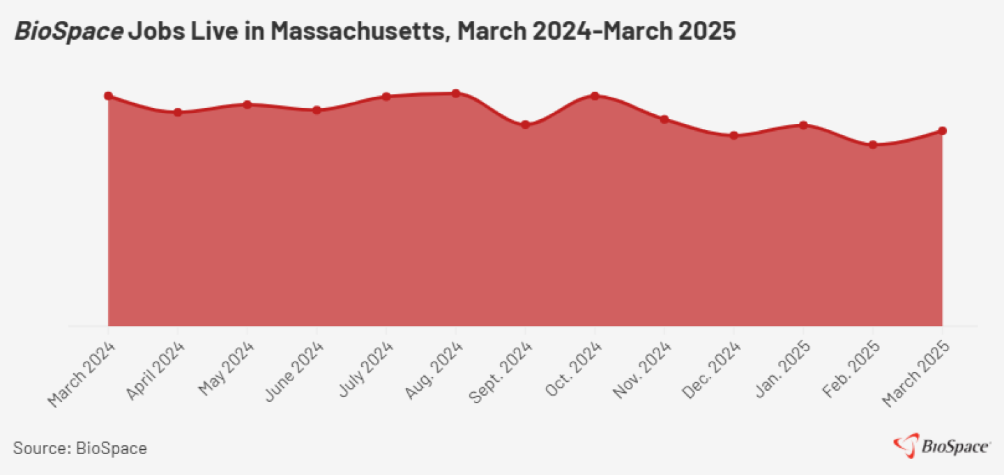 Regarding employment opportunities, in March, job postings live for Massachusetts on the BioSpace website were down slightly year over year but increased month over month. The data indicate that even in a tough job market, there are still many roles available in the state.