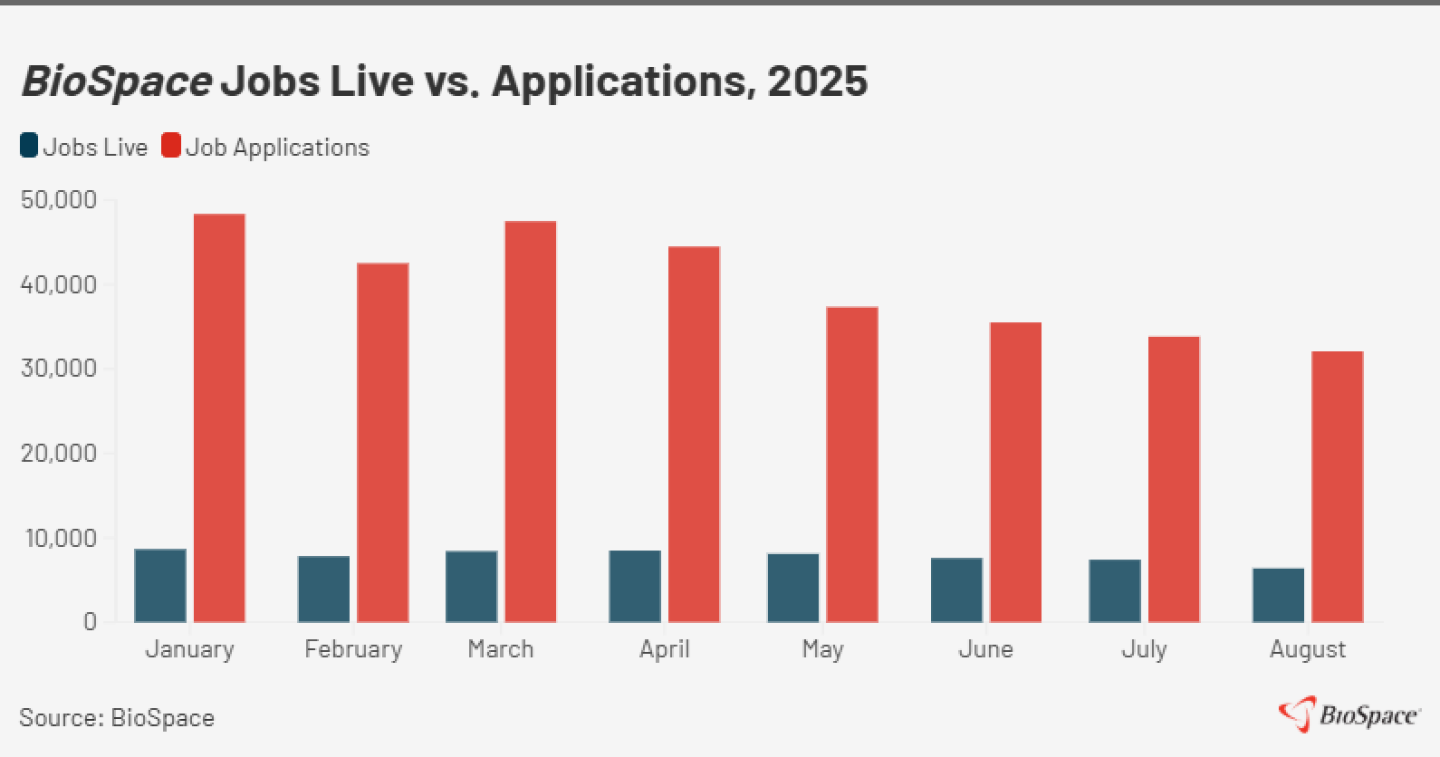 Biopharma professionals seeking work face limited job openings and high competition for those positions, based on BioSpace data. Job postings live on the website hit their lowest number yet for 2025 in August—6,385—and dropped 32% year over year. Meanwhile, applications last month (32,089) far outpaced postings, as has been the case throughout the year.