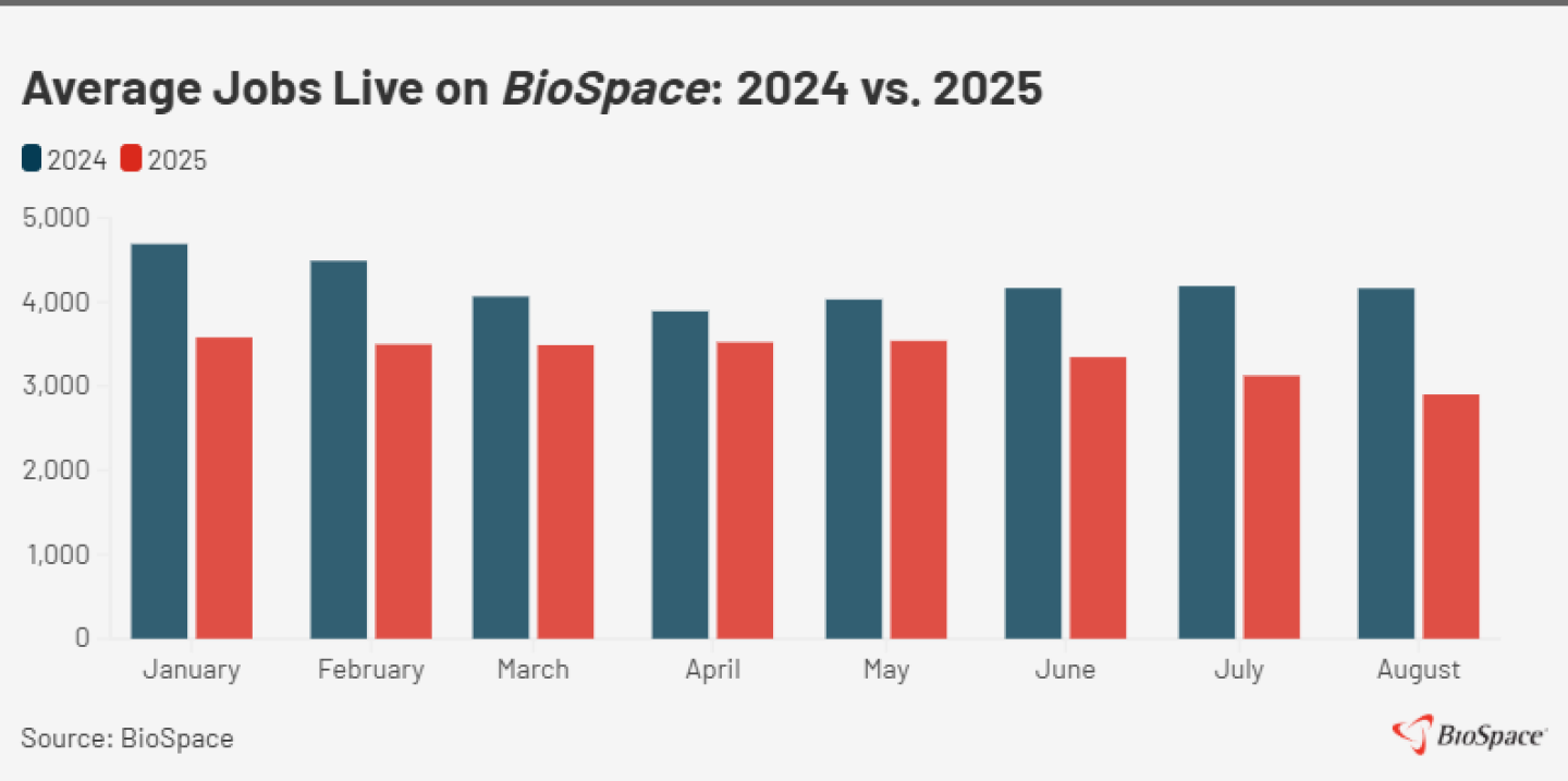 The biopharma job market remains challenging, based on BioSpace data. In August, job postings live on the website dropped 32% year over year. In addition, during the first eight months of 2025, over 26,000 people were laid off or projected to be laid off.