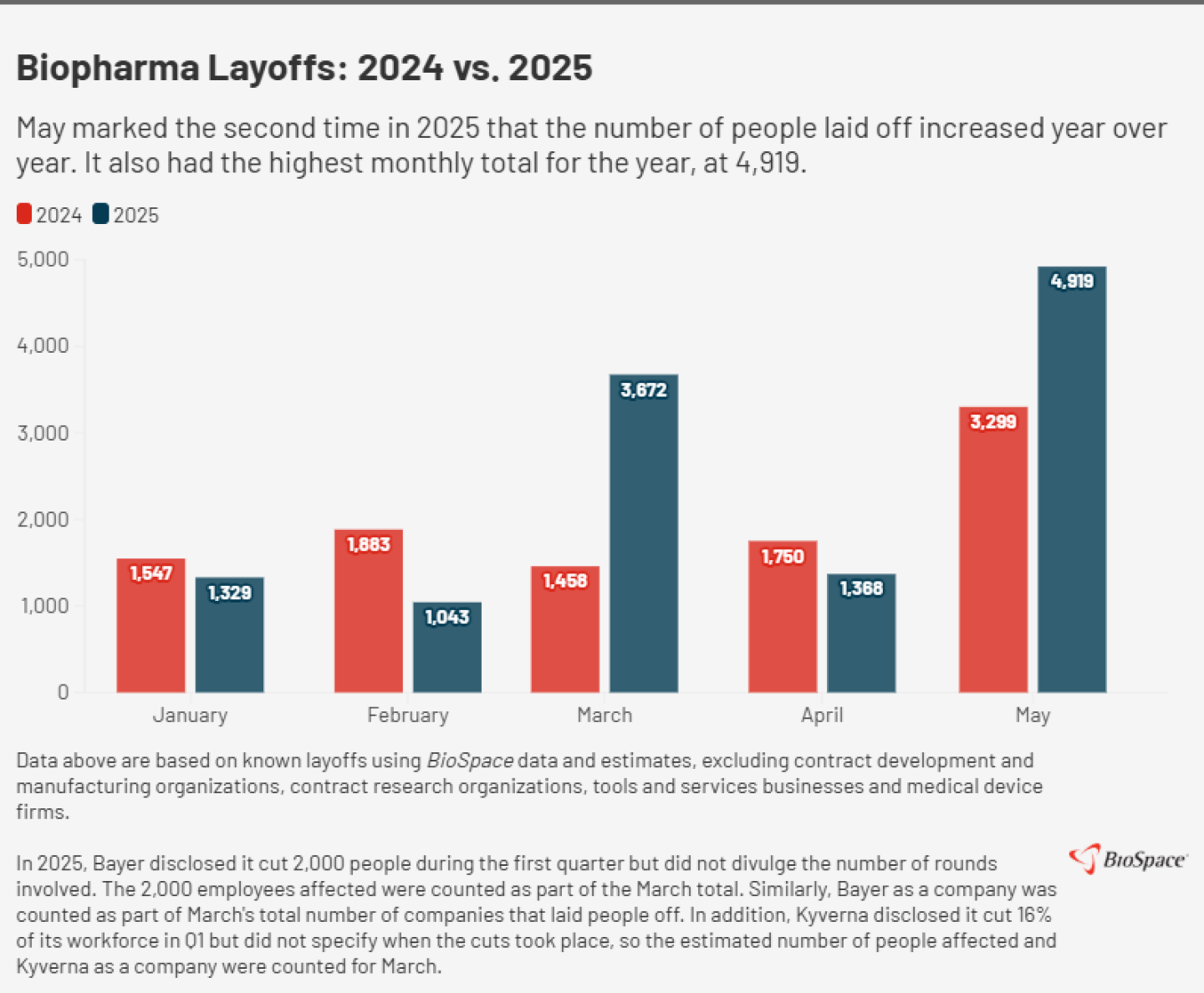 Layoffs have also been a concern for biopharma professionals, and in May, they hit their highest monthly total for 2025—4,919 employees—based on BioSpace tallies. Those tallies exclude contract development and manufacturing organizations, contract research organizations, tools and services businesses and medical device firms.