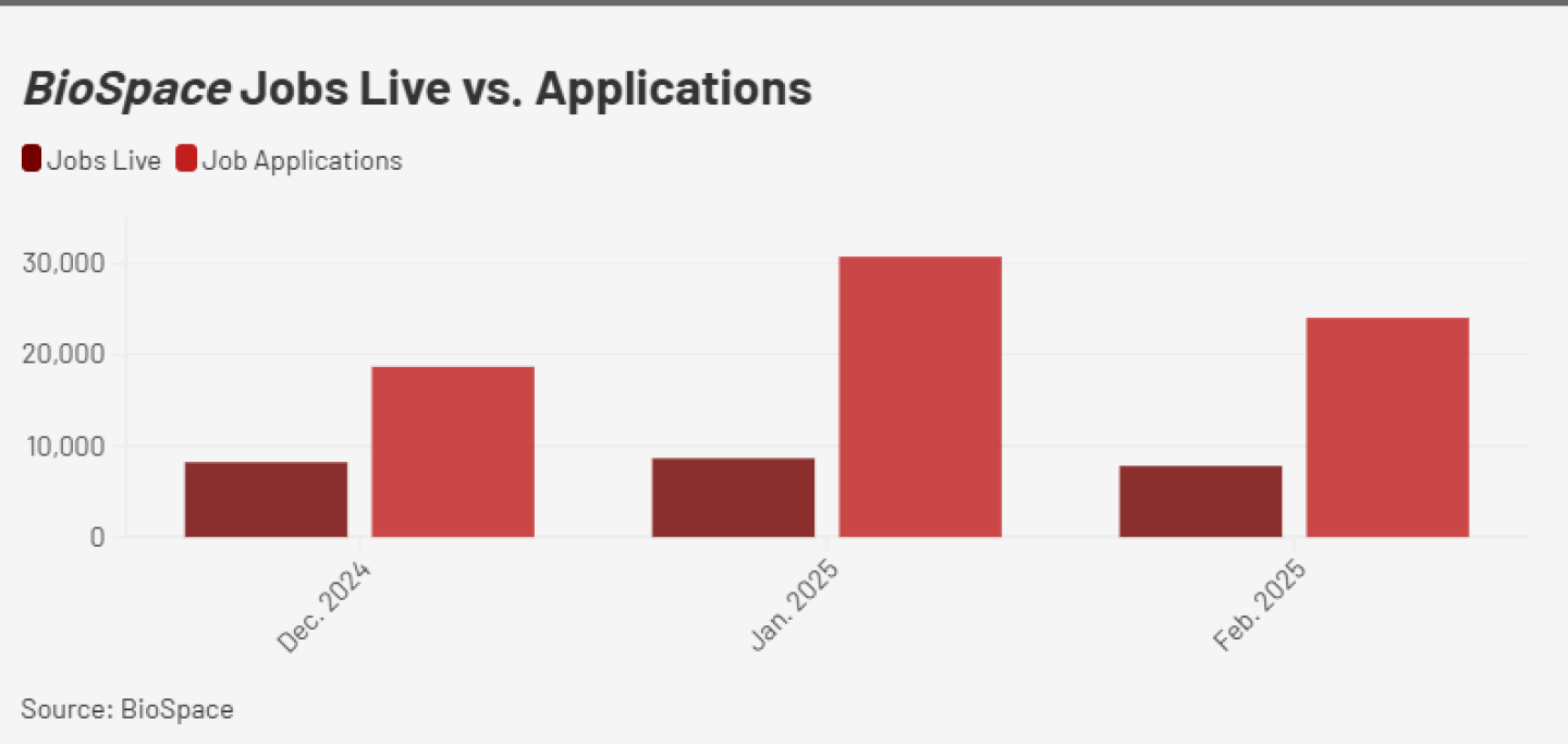 Job postings live on BioSpace dipped by 23% from February 2024 to February 2025, outpacing January’s 19% year-over-year decrease. Clouse said February’s drop may have happened in part because companies that posted positions in February 2024 and later froze their hiring have yet to lift that freeze.