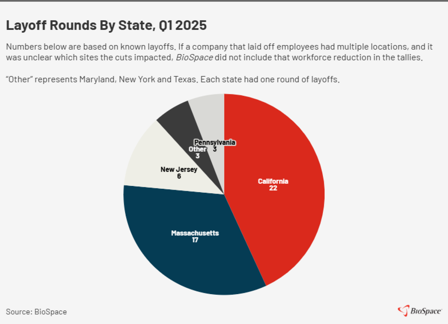 The majority of the first quarter’s biotech and pharma layoffs hit employees in the two most notable states for biopharma business—California and Massachusetts—according to BioSpace data. There were 22 rounds of layoffs in California and 17 in Massachusetts, compared to six in New Jersey, three in Pennsylvania and one each in Maryland, New York and Texas.