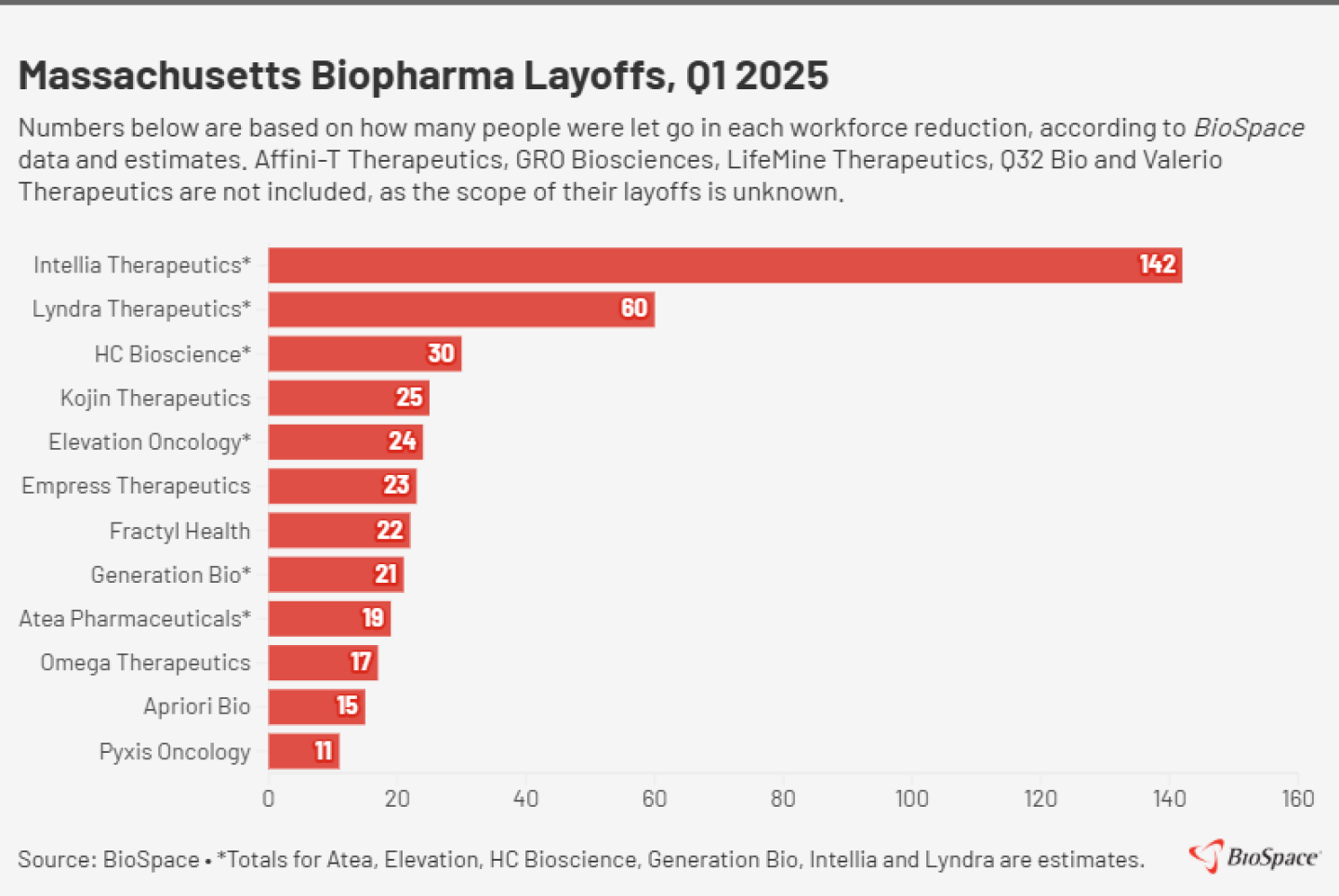 The largest workforce reduction in Massachusetts was at Cambridge, Massachusetts–based Intellia. In January, the company announced it was cutting about 27% of its employees “over the course of 2025” as part of a reorganization program. Based on employment data available at the time of the layoffs, BioSpace estimated the cuts could have affected about 140 people.