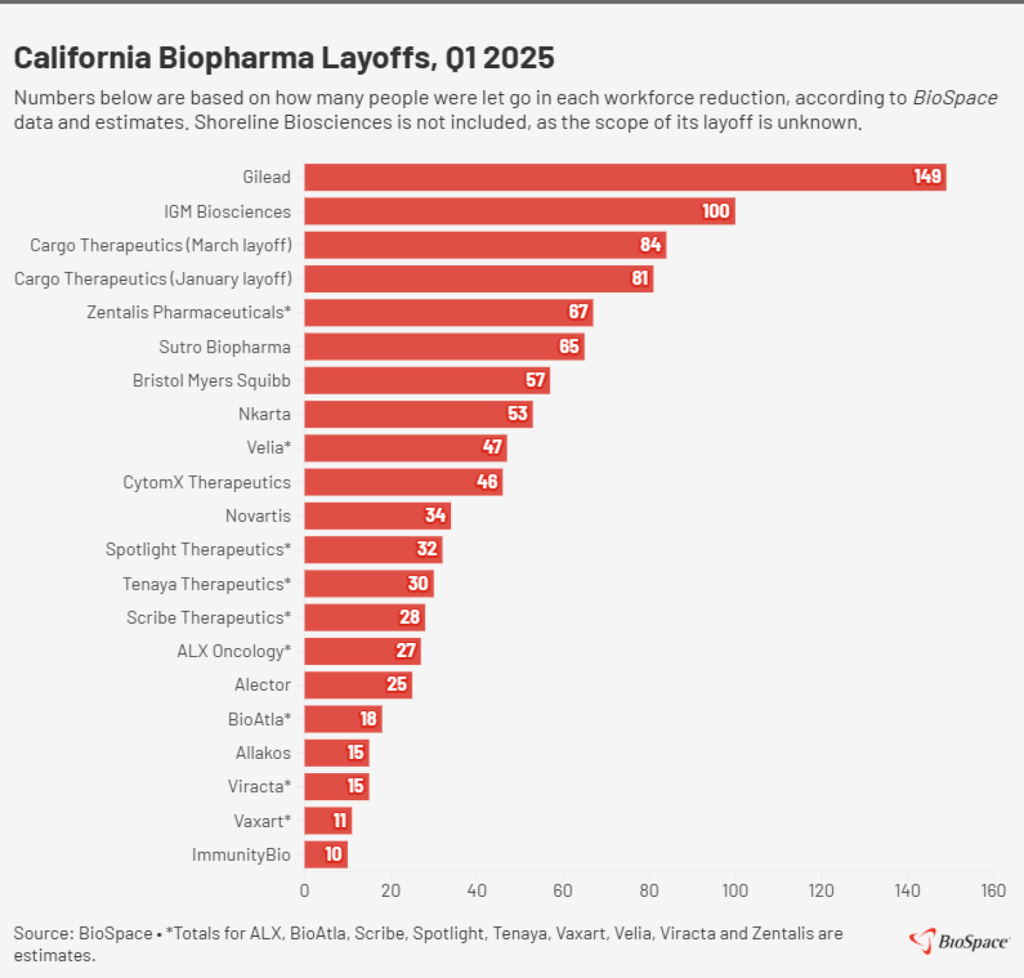 The largest layoff was at Gilead. In March, the company divulged it would let go of 149 employees at its Foster City headquarters, effective May 27, according to a WARN notice. Those cuts landed Gilead on the BioSpace list of the first quarter’s five largest biopharma layoffs. They followed a November disclosure that the company would let go of 104 people in Foster City, effective March 14.