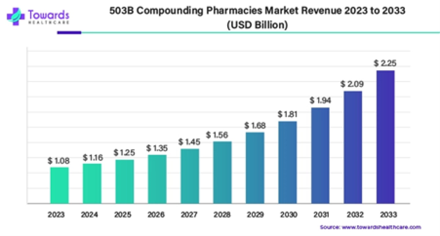 The global 503B compounding pharmacies market size was estimated at US$ 1.08 billion in 2023 and is projected to grow US$ 2.25 billion by 2033, rising at a compound annual growth rate (CAGR) of 7.63% from 2024 to 2033.