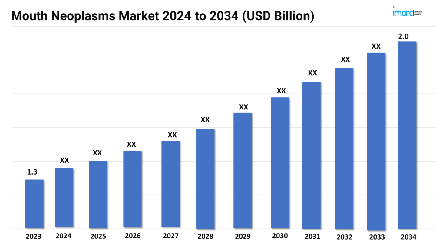 The mouth neoplasms market size reached a value of USD 1.3 Billion in 2023. Looking forward, the market is expected to reach USD 2.0 Billion by 2034, exhibiting a growth rate (CAGR) of 3.69% during 2024-2034. The market is witnessing a surge in early detection techniques and personalized therapies. Advances in immunotherapy and targeted treatments are enhancing patient outcomes. Additionally, there is a growing emphasis on minimally invasive surgical procedures and the integration of AI in diagnostic tools, driving market growth and innovation.