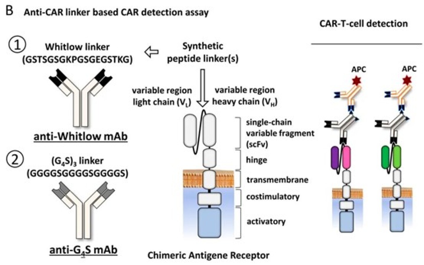 Anti-CAR linker monoclonal antibodies offer a universal strategy for CAR detection. Most CARs incorporate an scFv domain connected via flexible linkers such as Whitlow 218 or G4S. These standardized linker sequences provide a consistent and well-defined epitope. Regardless of the CAR’s target antigen (e.g., CD19, BCMA, Claudin18.2, or CD22), anti-linker antibodies can detect CAR expression accurately, significantly improving universality and consistency compared to antigen-specific detection methods.