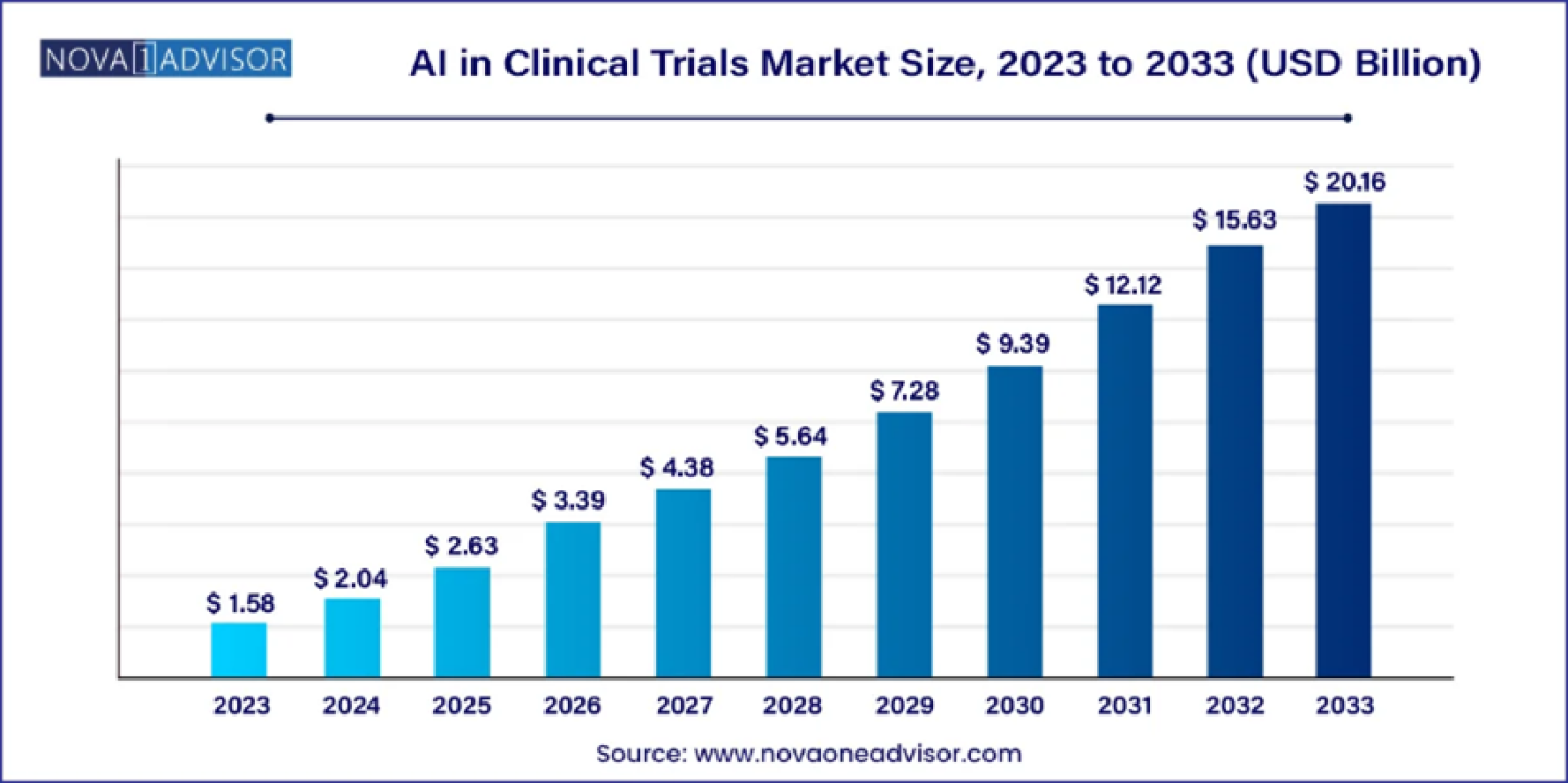 According to Nova One Advisor, the global AI in clinical trials market size was USD 1.58 billion in 2023, calculated at USD 2.04 billion in 2024 and is expected to reach around USD 20.16 billion by 2033, expanding at a CAGR of 29% from 2024 to 2033.