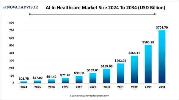 The global AI in healthcare market size is expected to be hit around 701.79 billion by 2034, increasing from USD 37.09 billion in 2025, representing a healthy CAGR of 38.64% from 2025 to 2034.