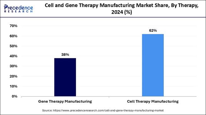 🔹 Cell therapy manufacturing dominated by therapy type, contributing over 62% of the 2024 revenue.