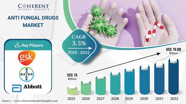 According to Coherent Market Insights, The Global Anti Fungal Drugs Market is estimated to be valued at USD 15 Bn in 2025 and is expected to reach USD 19.08 Bn in 2032, exhibiting a compound annual growth rate (CAGR) of3.5% from 2025 to 2032. The rising incidence of fungal infections, especially in immunocompromised patients, is driving significant growth in the antifungal drugs market. Advances in drug formulations and diagnostic technologies are further improving treatment efficacy and patient outcomes.