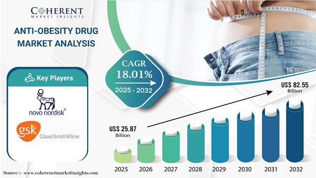 According to Coherent Market Insights (CMI), the global anti-obesity drug market size is expected to grow nearly 3.2X by 2032, increasing from USD 25.87 Bn in 2025 to USD 82.55 Bn by 2032.