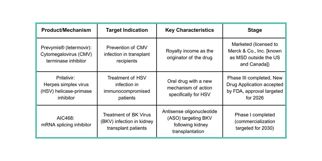 Aicuris adds three antiviral assets spanning marketed and clinical-stage development, complementing Asahi Kasei’s existing treatment portfolio. This includes a consistent royalty stream from Prevymis®; a near-term commercial opportunity with pritelivir, for which the U.S. Food and Drug Administration (FDA) granted Priority Review to the New Drug Application, with a Prescription Drug User Fee Act (PDUFA) target date in the fourth quarter of 2026; and AIC468 as a longer-term growth driver.