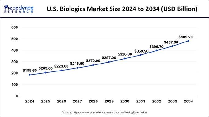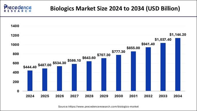 Precedence Research predicts the global biologics market size will grow from USD 487 billion in 2025 to approximately USD 1,144.20 billion by 2034, with a CAGR of 9.96% from 2025 to 2034. Growth is driven by the rising prevalence of chronic and autoimmune diseases, rapid adoption of biosimilars, and sustained R&D investments in advanced biologics such as monoclonal antibodies, vaccines, and cell-based therapies.
