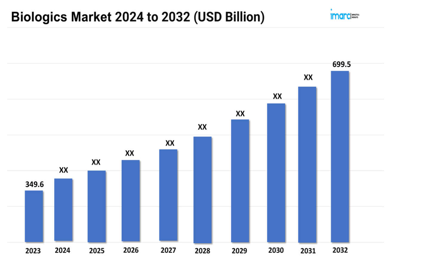 The biologics market size reached a value of USD 349.6 Billion in 2023. Looking forward, the market is expected to reach USD 699.5 Billion by 2032, exhibiting a growth rate (CAGR) of 7.8% during 2024-2032.