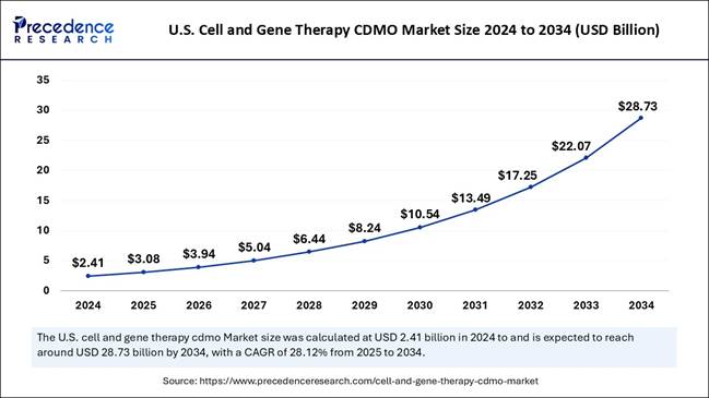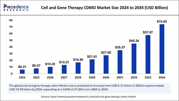 According to Precedence Research, the global cell and gene therapy CDMO market size is expected to be worth over USD 74.03 billion by 2034, increasing from USD 8.07 billion in 2025. The market is expected to expand at a healthy CAGR of 27.92% from 2025 to 2034.