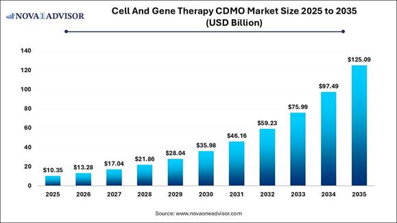 According to Nova One Advisor, the global cell and gene therapy CDMO market is estimated to be valued at USD 13.28 billion in 2026 and is expected to hit around USD 125.09 billion by 2035, exhibiting a compound annual growth rate (CAGR) of 28.3% from 2026 to 2035.