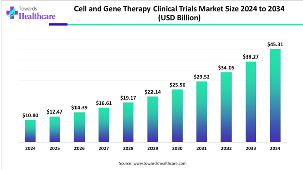 According to Towards Healthcare research, the global cell and gene therapy clinical trials market size is calculated at USD 10.8 billion in 2024, grew to USD 12.47 billion in 2025, and is projected to reach around USD 45.31 billion by 2034. The market is expanding at a CAGR of 15.43% between 2025 and 2034. The global cell and gene therapy clinical trials market is driven by the expanding industries and growing innovations.