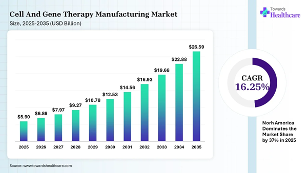 The global cell and gene therapy manufacturing market size is calculated at USD 5.90 billion in 2025, grew to USD 6.86 billion in 2026, and is projected to reach around USD 26.59 billion by 2035. The market is expanding at a CAGR of 16.25% between 2025 and 2035.