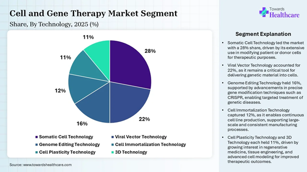 conditions. Technology Insights Technology Type Market Share (%) Somatic Cell Technology 28% Viral Vector Technology 22% Genome Editing Technology 16% Cell Immortalization