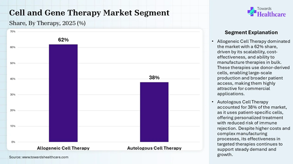 Market: Segmentation Analysis Therapy Insights Therapy Type Market Share (%) Allogeneic Cell Therapy 62% Autologous Cell Therapy 38%