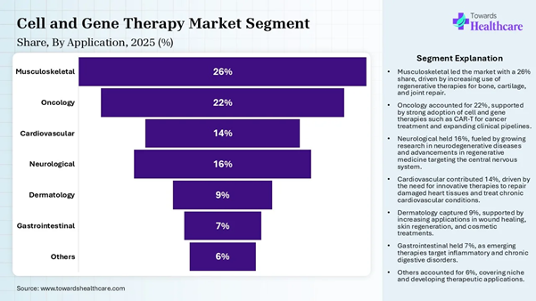 the most widely used targets in gene therapy trials. Application Insights Application Market Share (%) Musculoskeletal 26% Oncology 22% Cardiovascular 14% Neurological 16% Dermatology 9% Gastrointestinal 7% Others 6%